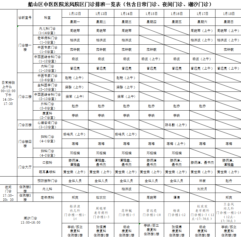 - 便民服务丨船山区中医医院龙凤院区1月12日-1月18日门诊排班表